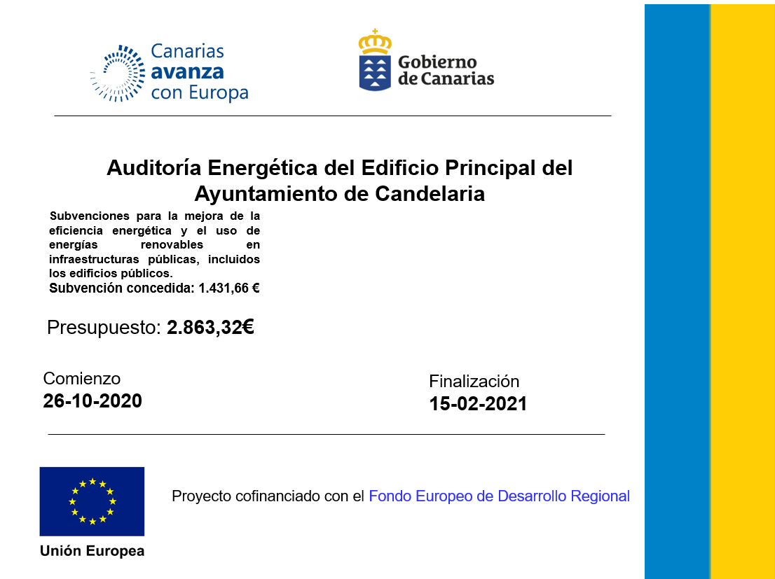 Con el objetivo de continuar trabajando en la sostenibilidad y en la mitigación de los efectos del cambio climático en el municipio, el Ayuntamiento de Candelaria solicitó 4 proyectos a la línea de subvenciones para la mejora de la eficiencia energética y el uso de energías renovables en infraestructuras públicas, incluidos los edificios públicos convocadas por la Consejería de Transición Ecológica, Lucha contra el Cambio Climático y Planificación Territorial del Gobierno de Canarias en el año 2020, una subvención cofinanciada con FEDER, dentro del programa operativo de Canarias.