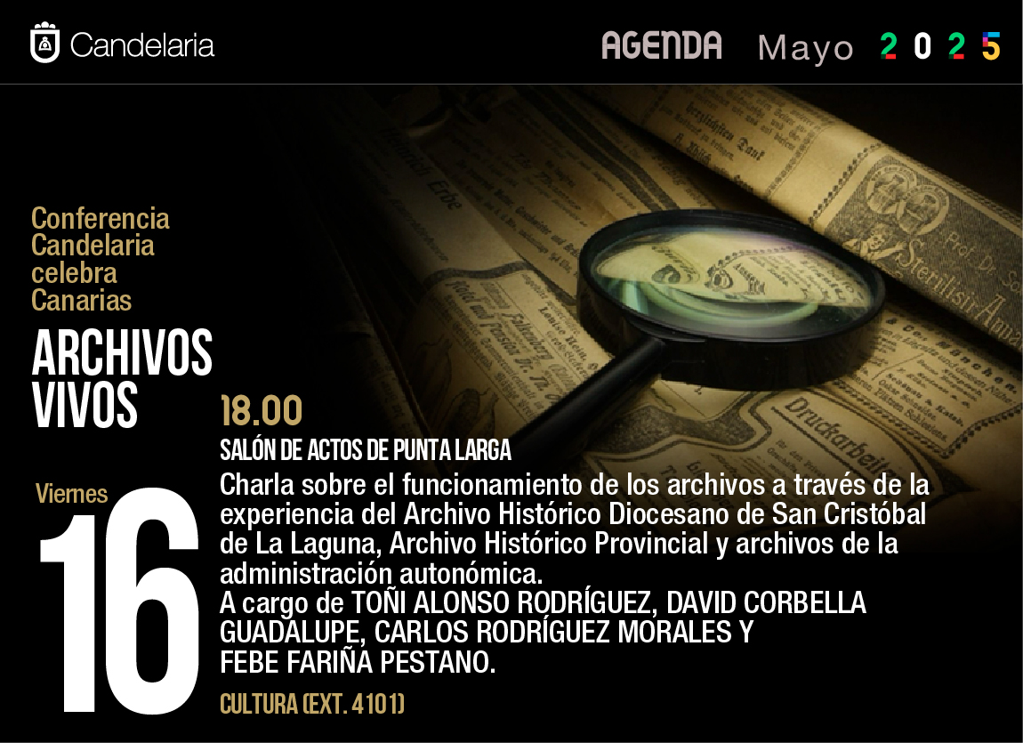 ARCHIVOS VIVOS 18.00 SALÓN DE ACTOS DE PUNTA LARGA Charla sobre el funcionamiento de los archivos a través de la experiencia del Archivo Histórico Diocesano de San Cristóbal de La Laguna, Archivo Histórico Provincial y archivos de la administración autonómica. Leer más...